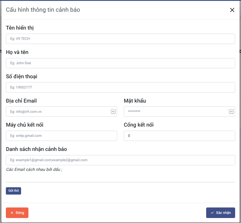 Cấu hình thông tinđể cấu hình hoặc sửa đổi thông tin thông tin email gửi cảnh báo