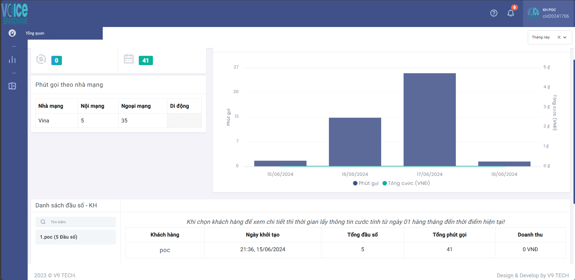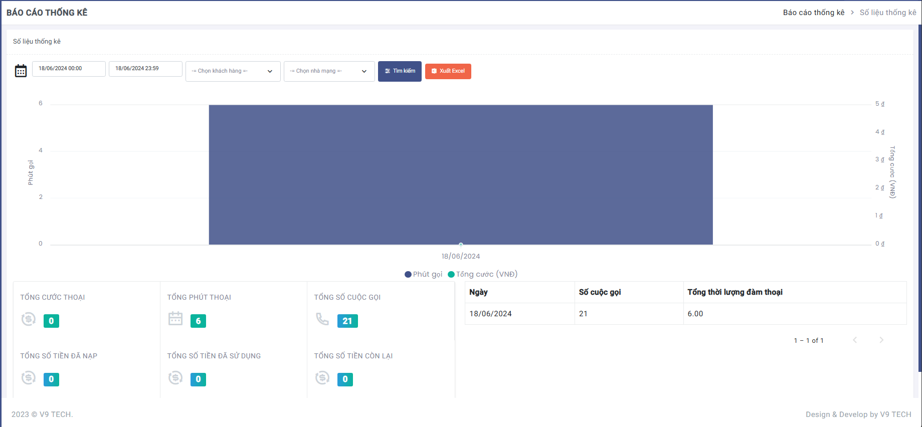 Màn hình số liệu thống kê, có thể lọc dữ liệu theo thời gian, khách hàng, đầu số, nhà mạng. Xuất dữ liệu đã lọc ra file Excel