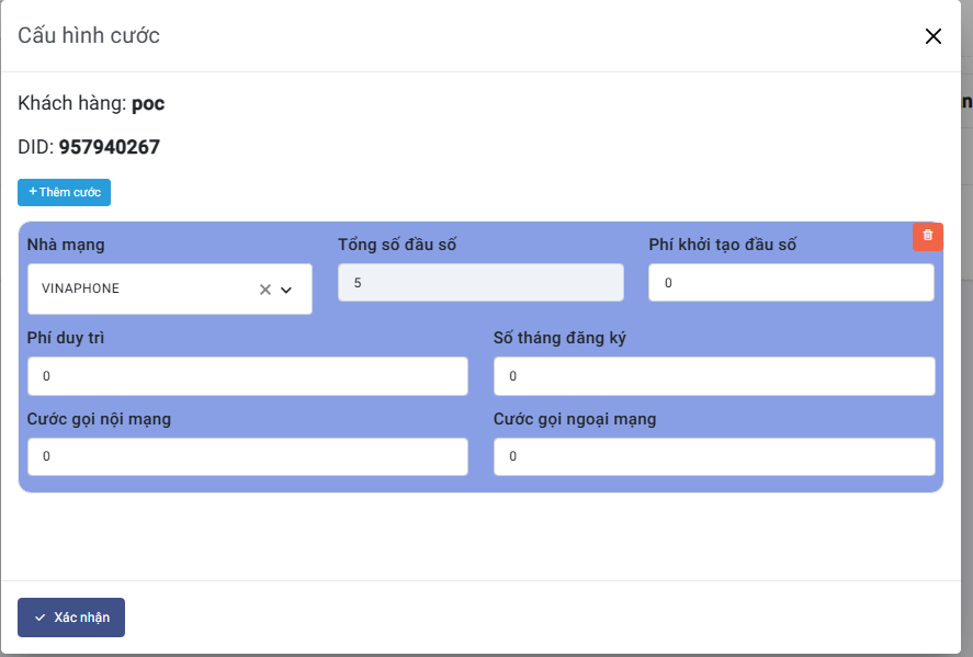 Nhập thông các thông tin: Phí khởi tạo đầu số,Phí duy trì,Cước gọi nội mạng,Cước gọi ngoại mạng,Số tháng đăng ký
