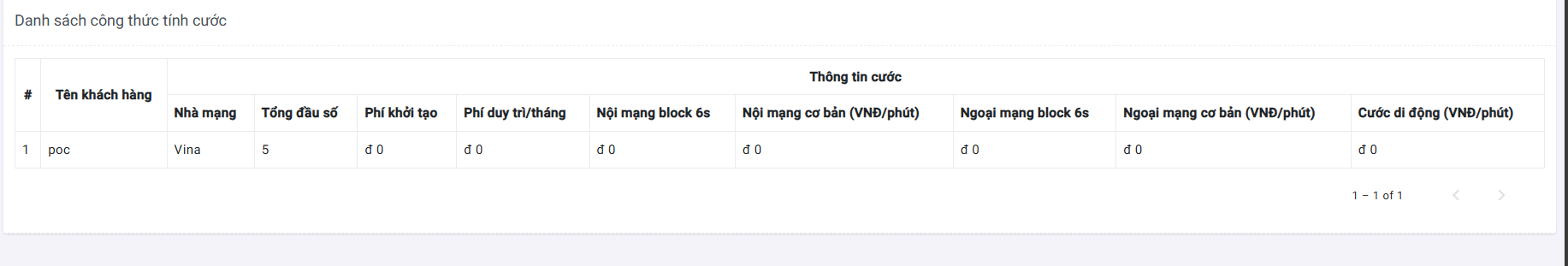 Tại trang này sẽ hiển thị danh sách các công thức tính cước đã cấu hình cho khách hàng