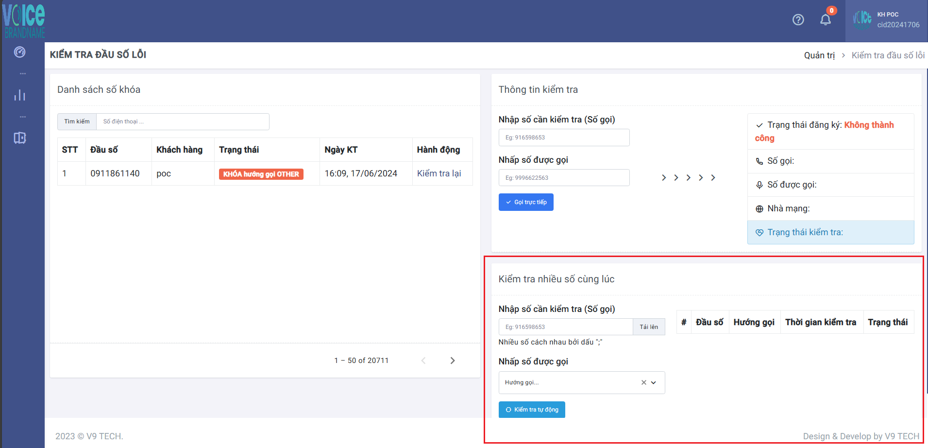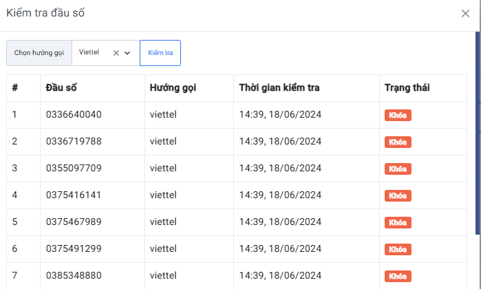 Chọn hướng gọi cần kiểm tra và nhấn kiểm tra, hệ thống sẽ hiển thị các số bị khoá sau khi quá trình kiểm tra hoàn tất