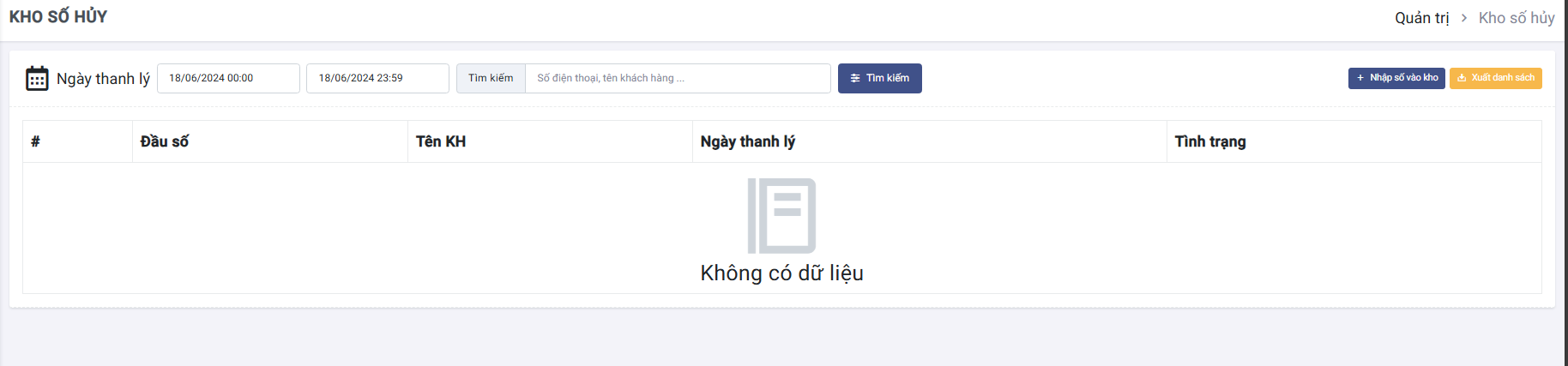 Màn hình kho số huỷ hiển thị các số đã được thanh lý. Có thể lọc dữ liệu theo thời gian, số điện thoại, tên khách hàng. Có thể xuất dữ liệu ra file Excel