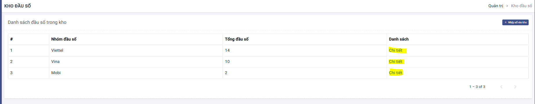 Màn hình kho số hiển thị các số đang có sẵn trong kho, được phân loại theo nhà mạng, bấm chi tiết ở cột Danh sách để xem các đầu số