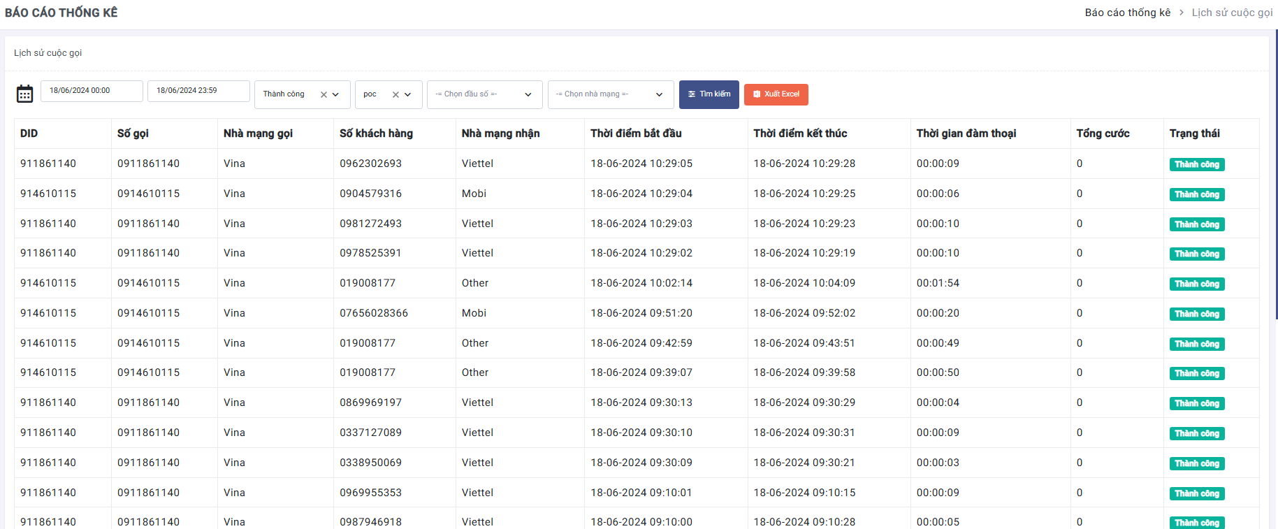Màn hình số lịch sử cuộc gọi, chọn khách hàng và click Tìm kiếm để xem lịch sử. Có thể lọc dữ liệu theo thời gian, trạng thái, đầu số, nhà mạng. Xuất dữ liệu đã lọc ra file Excel