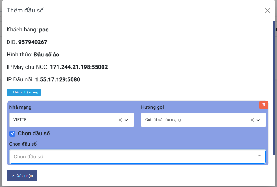 Thêm nhà mạng.Chọn nhà mạng và hướng và hướng gọi cho số được cấp.